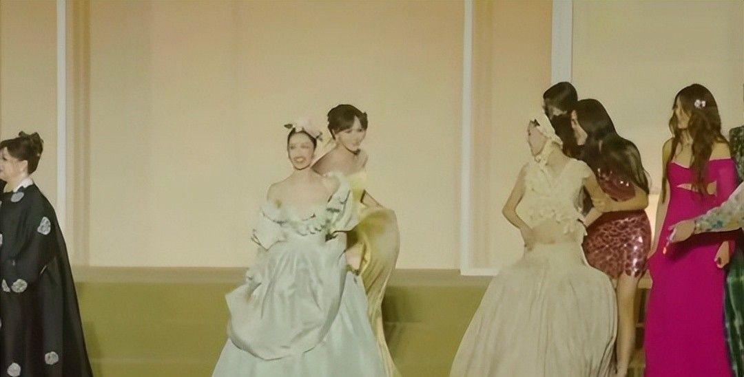 5. 当其他嘉宾都谦逊地站在边缘等待安排时,她却早早占据了舞台正中央的位置,手提华丽裙摆,神情自若。